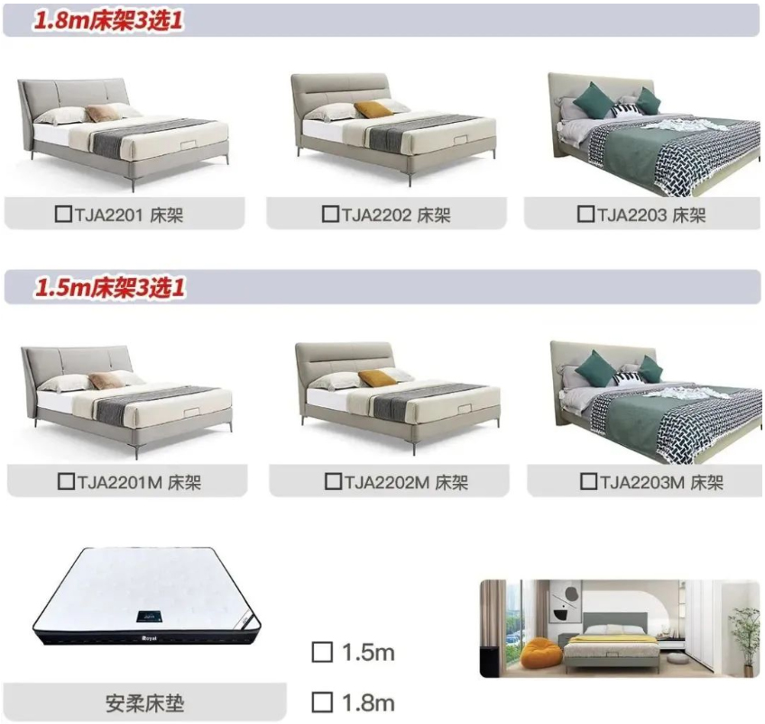 TJA2203床架(1.8m)*1+1.8m安柔床垫*1+TJA2203M床架(1.5m)*1+1.5m安柔床垫*1+TJC2201B床头柜*2