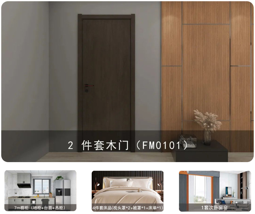 7m 橱柜【地柜+台面+吊柜】+2 件套木门(FM0101)+1 套次卧窗帘+4 件套床品【枕头罩*2+被罩*1+床单*1】