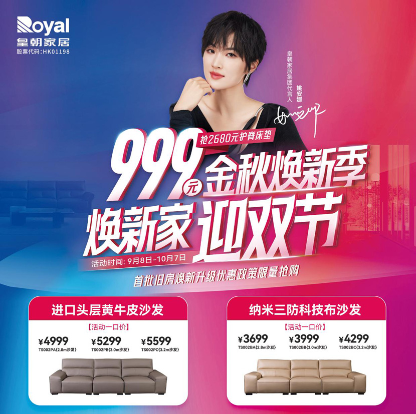 除了全屋定制优惠外,皇朝家居还在本次“焕新家·迎双节”大促中推出一批爆款沙发和家具套餐组合,沙发系列和软体系列优惠力度也是前所未有,正因为我们懂你更懂家 让您真的实惠到家。