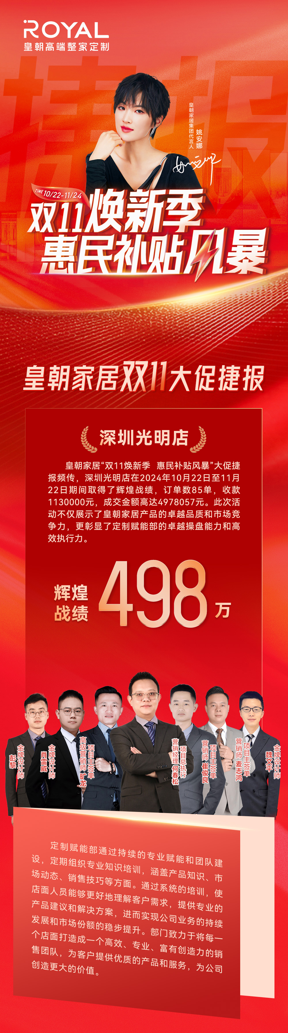 销售额498万,皇朝高端整家定制深圳光明店双11大促再创辉煌战绩