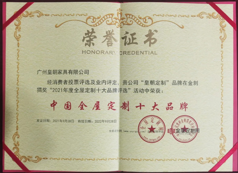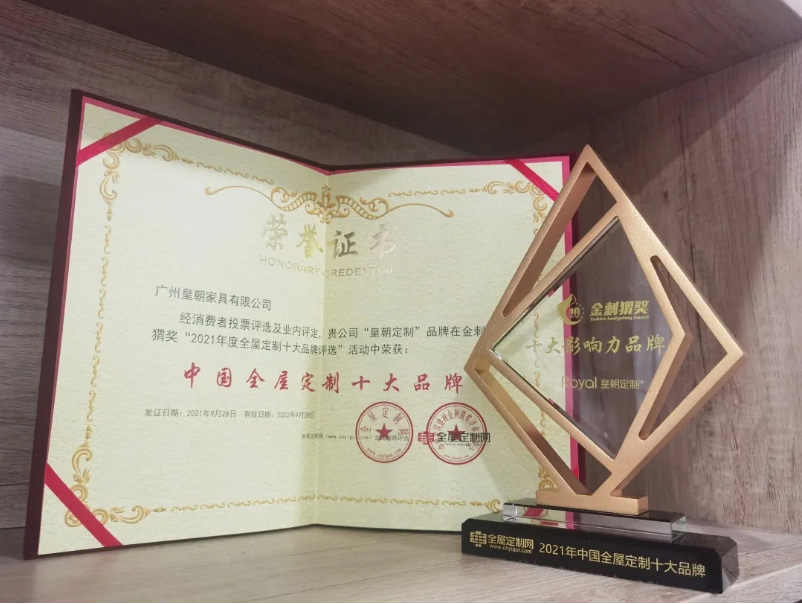 本次评选,皇朝定制以优秀的品牌影响力位列全屋定制十大品牌榜,斩获大奖“十大影响力品牌”。