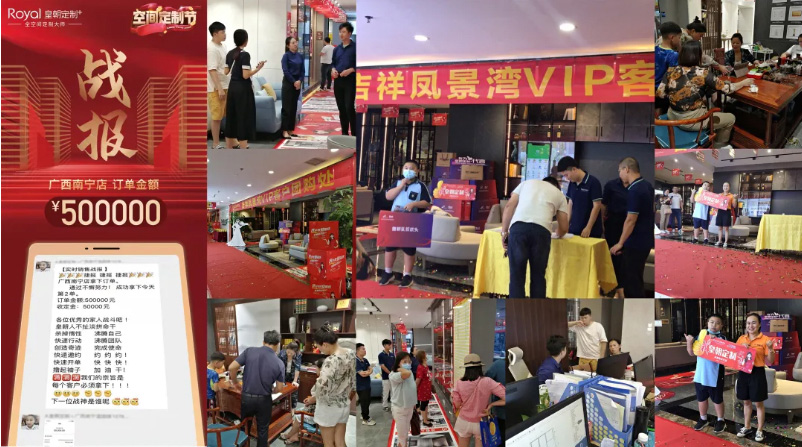 直播、微商城、VIP客户微信群、线上下单平台……皇朝定制品牌总部利用网络平台赋能终端,尤其是在今年“全屋家具联购节”和“空间定制节”两场大型的全国联动促销活动,线上线下互相配合推进,各地门店频频传来捷报,价值十来万的订单不计其数,甚至有单笔订单金额超50万的出现。