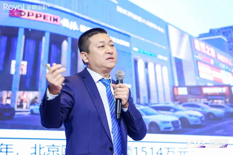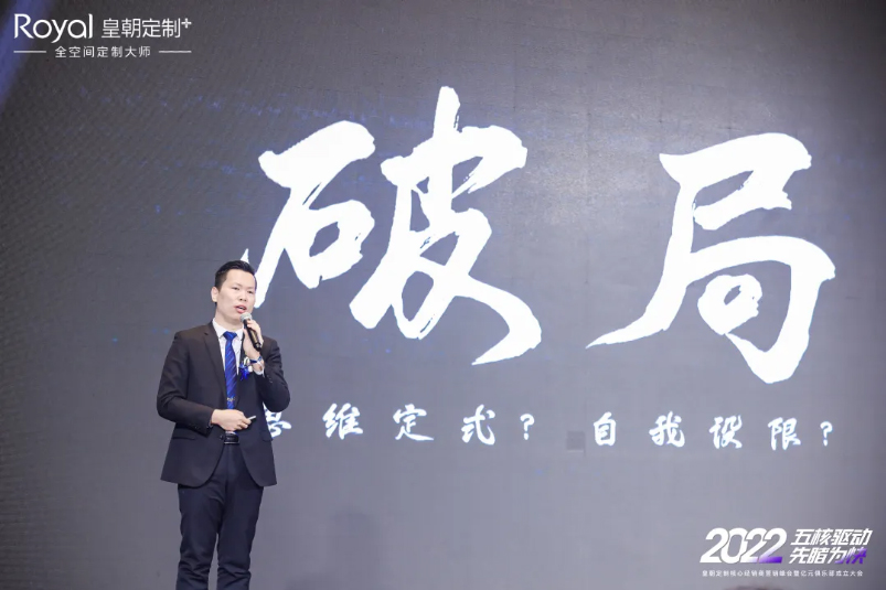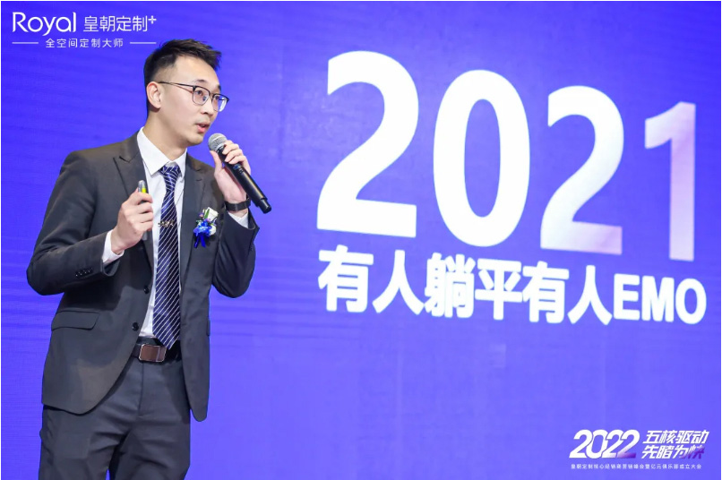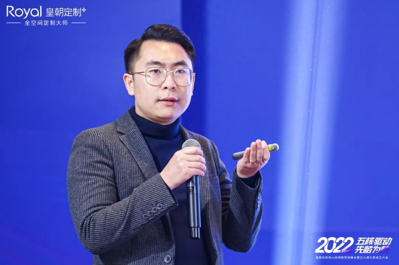 图|皇朝定制营销总监袁丹先生发表《五核驱动,先睹为快》主题演讲,讲述皇朝定制2022市场核心力量规划。