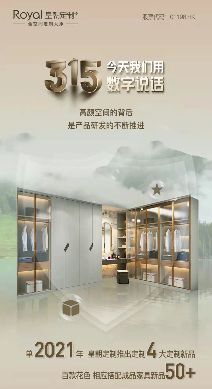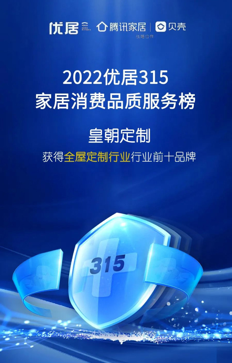 皇朝定制凭借优质的产品和服务,登榜2022优居315家居消费品质服务榜,荣获全屋定制行业前十品牌,我们做好产品,以数字为诚意,以实力说话,获得Z世代新消费者的信赖。