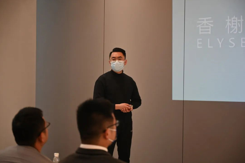 新店设计部经理李国宝先生为现场家居建材精英介绍新品。