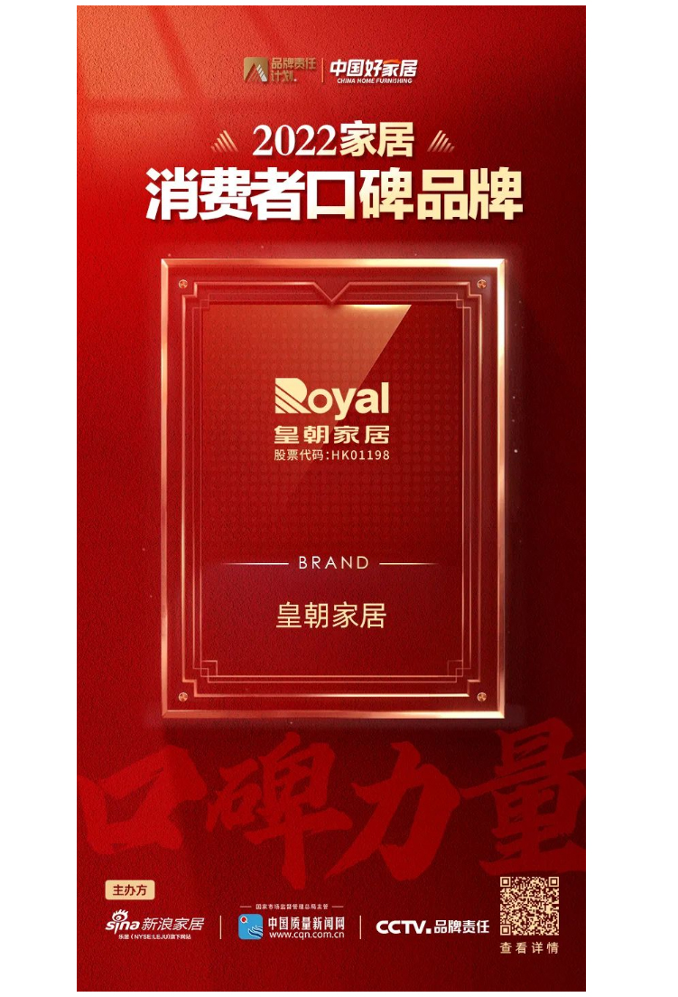 “洞悉口碑消费之下的价值驱动,用消费口碑见证品牌力量”。新浪家居携手中国质量新闻网、CCTV品牌责任于3月15日-5月10日,全面开展《中国好家居——2022中国家居消费者口碑调查》活动。本次活动由全国工商联家具装饰业协会、中国建筑装饰协会住宅装饰装修和部品产业分会、中国室内装饰协会、中国建筑材料流通协会、中国木材与木制品流通协会、中国轻工业联合会健康家居专业委员会6大协会全程指导,乐居商学院和家页智库为本次活动提供研究支持。通过广大消费者网络问卷调查,千余名行业专家、设计师及家居从业人员综合评审,皇朝家居荣登2022家居消费者口碑品牌榜。