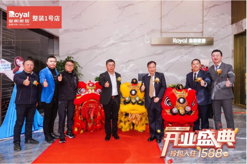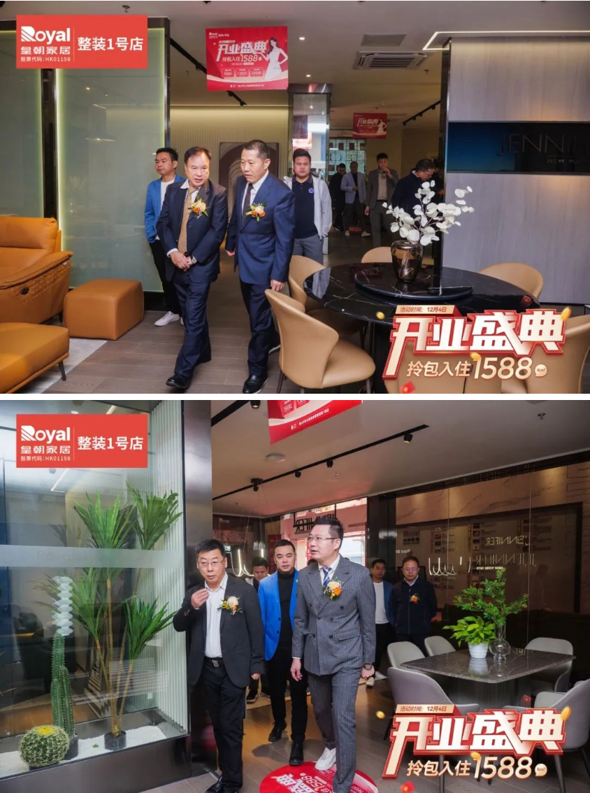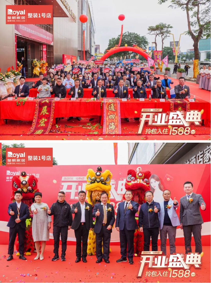 皇朝家居集团董事会主席谢锦鹏;广东省家居业联合会执行主席蒋德辉;皇朝家居集团董事伍顶亮;集团董事局主席助理黄晓文;集团常务副总裁、大家居业务CEO褚汉青;集团大家居业务CEO、皇朝定制事业部董事长陈浩;海门皇朝家居总经理曹卫东;皇朝家居佛山整装1号店房东周润枝;集团直营佛山分公司总经理解彪莅临现场,共同为新店开业献上美好祝愿。