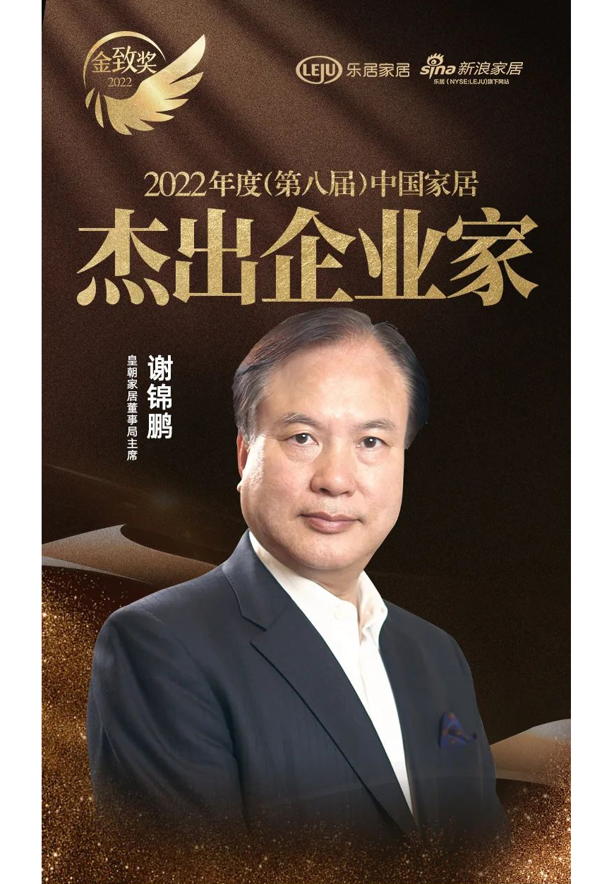 2022年12月26日,『趁势·再起——2022中国家居新时代盛典暨金致奖颁奖典礼』在云端盛大举行。由乐居家居主办、新浪家居承办,大国品牌、家页智库、大国中居联合主办的2022中国家居「金致奖」评选在盛典隆重揭晓。皇朝家居董事长谢锦鹏荣获「2022中国家居杰出企业家」称号。