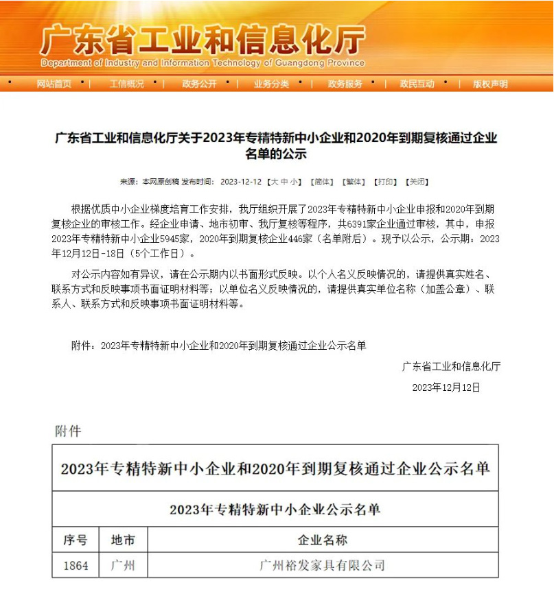 近期,广东省工业和信息化厅公示了关于《2023年专精特新中小企业和2020年到期复核通过企业名单的通告》,皇朝家居所属公司广州裕发家具有限公司(以下简称“裕发家具”)成功获评广东省“专精特新”企业认定。