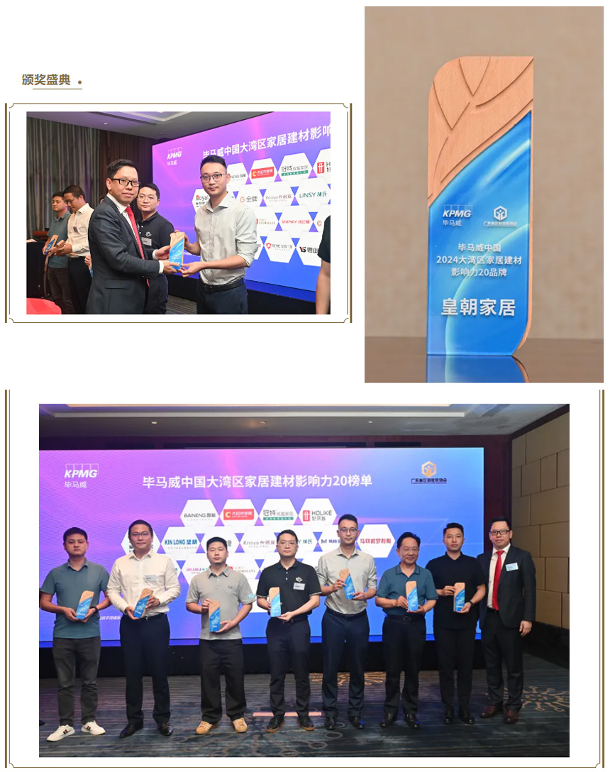 发布会现场举行了「2024大湾区家居建材影响力20品牌」颁奖典礼,皇朝家居凭借着强大的制造实力、高质的产品力和雄厚的品牌实力,从众多企业中脱颖而出,实至名归入选“2024大湾区家居建材影响力20品牌”。这既是业内对皇朝家居在家居建材领域深度耕耘与企业质量的高度认可,也彰显了其综合实力和发展潜力。