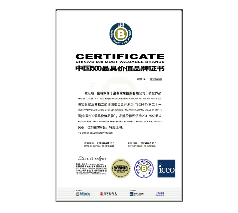 6月19日,第二十一届世界品牌大会在京举行。会上,主办方世界品牌实验室(World Brand Lab)发布了2024年《中国500最具价值品牌》分析报告。基于财务数据、品牌强度和消费者行为分析等关键因素的综合评估,皇朝家居以品牌价值231.75亿元再度登榜,位列第367名。迄今为止,皇朝已连续上榜3年,品牌价值稳步增长,展现出企业发展的非凡实力。