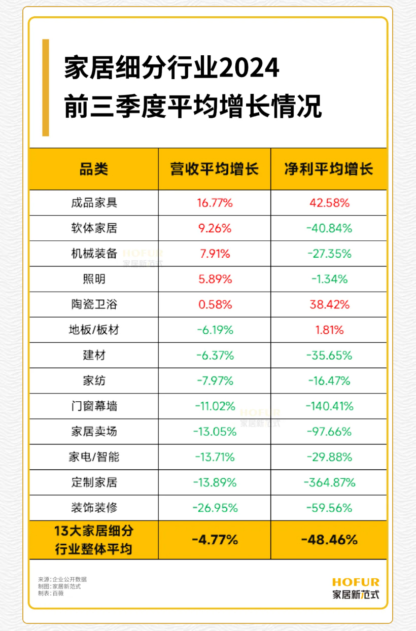 家居新范式对13个细分品类、115家上市家居公司的统计研究发现,今年前三季度,各细分行业的营业收入平均降幅为-4.77%,净利润平均降幅为-48.46%,出现罕见双双增幅下滑的局面。