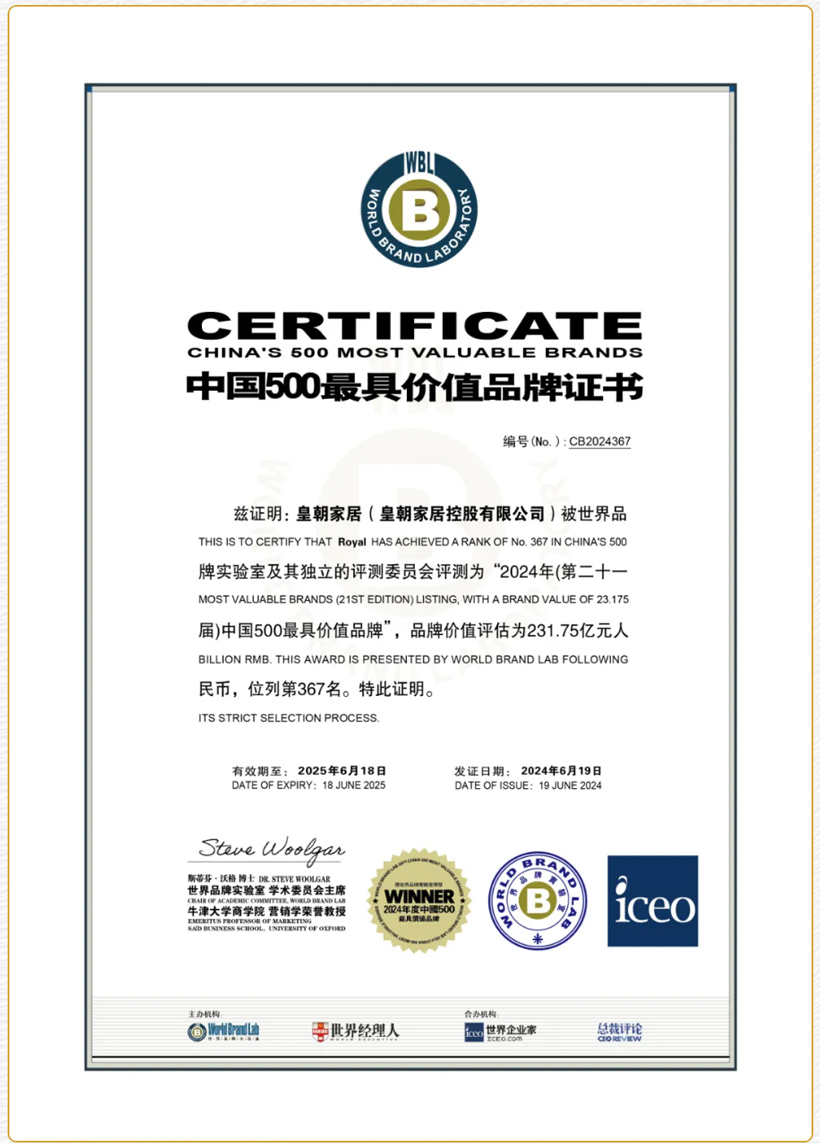 用林如海的话说,在2003年皇朝家居就已经确定了品牌定位,“皇朝家居不只是一个生产工厂,我们要做的是品牌公司”。这在OEM、贴牌盛行的当时,的确是一个高瞻远瞩的点。难能可贵的是,皇朝家居将品牌化道路一直践行到现在。这也就不难理解,其为什么能连续三年都在“中国500最具价值品牌”榜上占据一席之地。