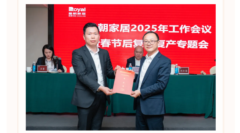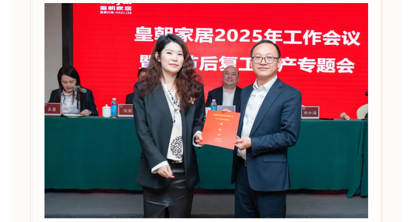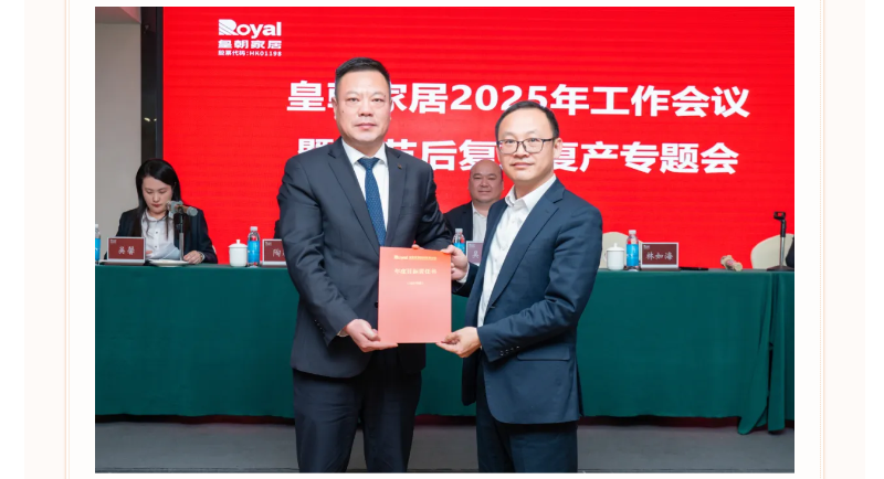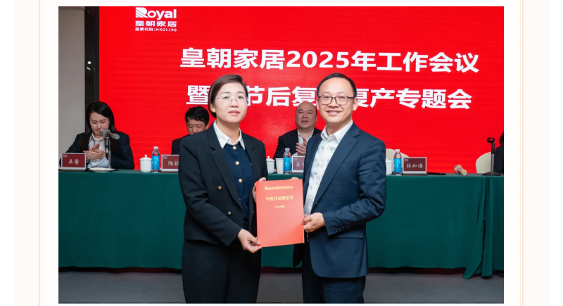 各职能部门、事业部、子公司代表依次递交2025年度目标责任书,明确将进一步压实工作责任,护航皇朝家居高质量发展行稳致远。