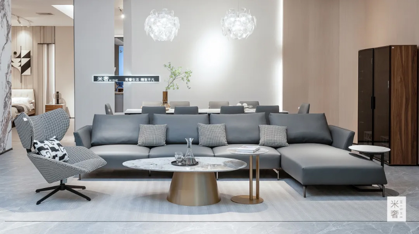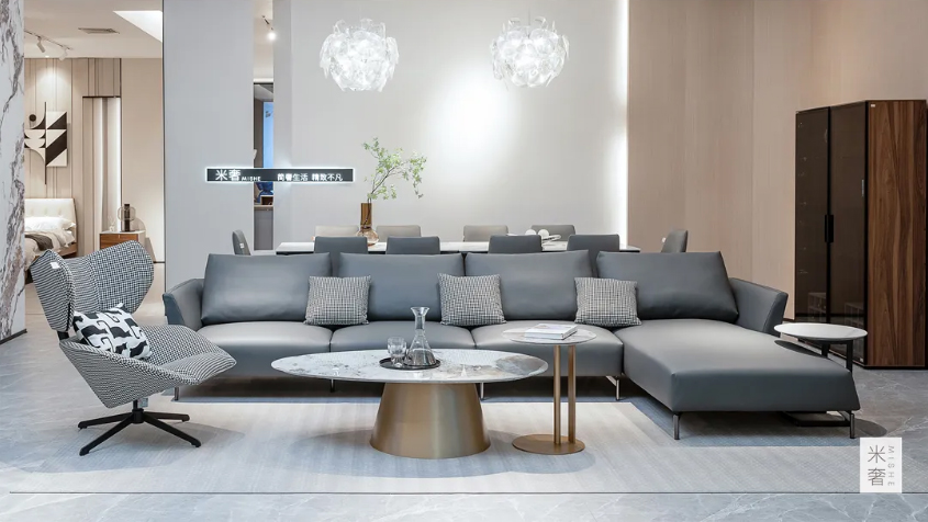 深灰色L型沙发的选择,不仅大大提升客厅的舒适度与实用性,还起到了平衡空间色彩的作用,展现出超脱浮华的高雅气质。