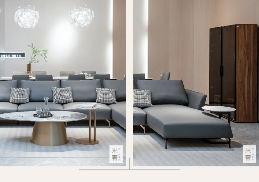 客厅空间是简与奢的融合,简在少而精的理性思考,没有过多繁复的装饰,用较少的设计打造出具有张力的空间,使简约与实用并重,给人以高级且精致的氛围感受;而奢则体现在对材质的运用,进口奢石岩板、三防科技生态皮、优质五金脚,将高雅奢华与时尚精致凝固在客厅空间中,赋予家居生活无限的想象。