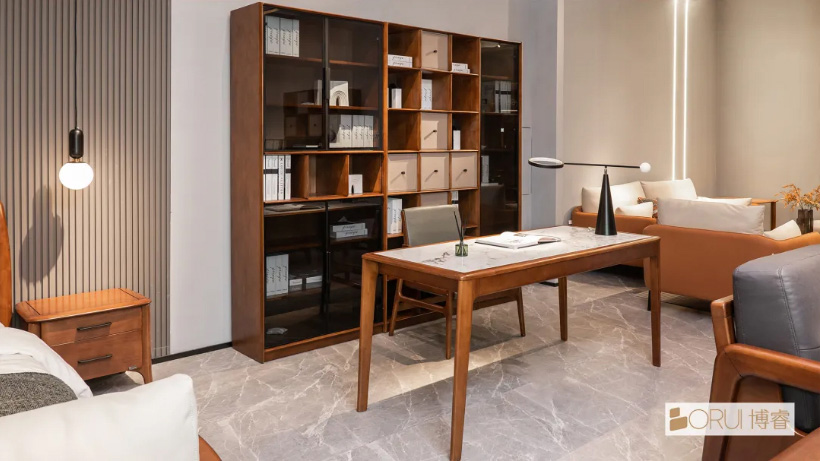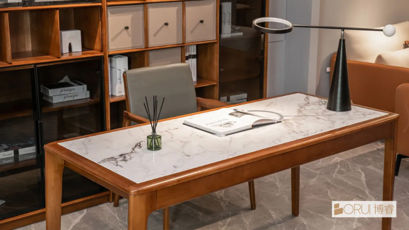 大理石台面,清晰明亮,耐磨防污易打理;皮革座椅,奢华典雅,透气亲肤弹性好。大理石搭配皮革元素,为书房营造出明亮简洁的阅读氛围。