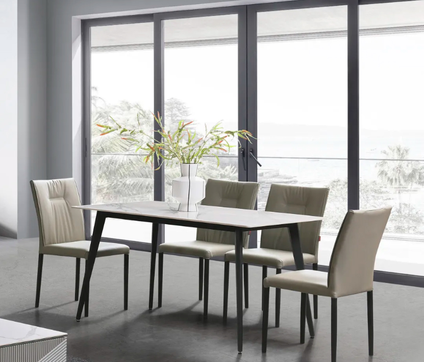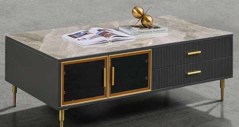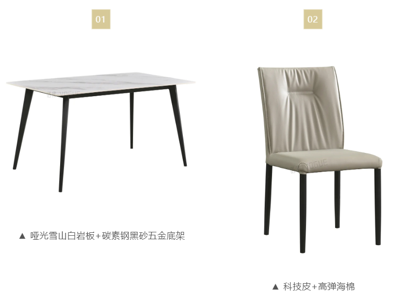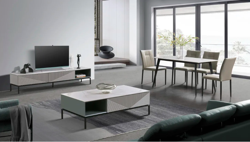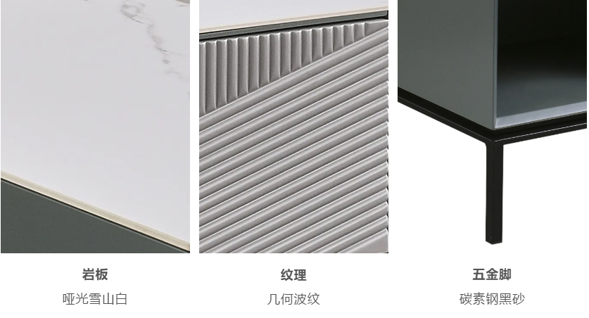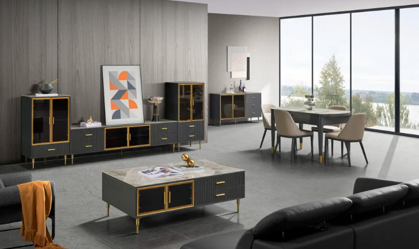 以茶几为例,台面采用意大利浅灰亮光岩板,色泽雅致清新,纹理飘逸灵动,营造出极具艺术气息的格调空间。此外,金色边框玻璃门搭配黑色烤漆柜体,通过简单的线条勾勒,走出千篇一律,在简与奢之间寻得平衡。