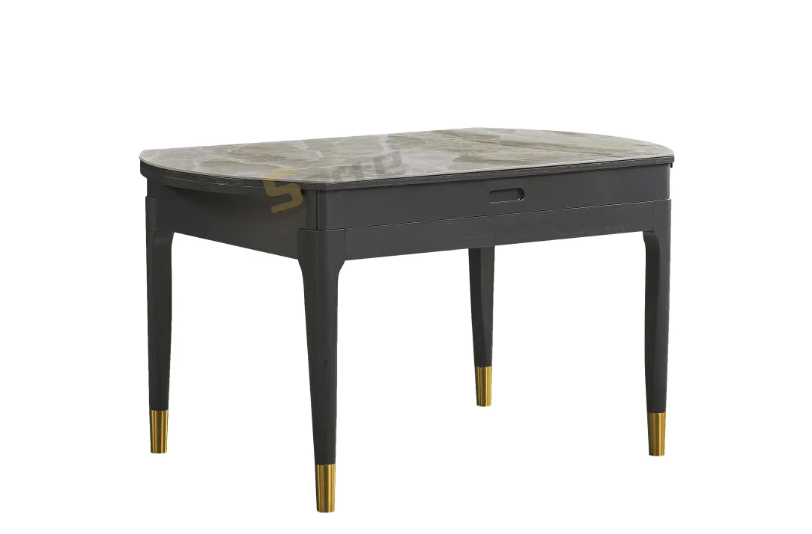 餐厅延续客厅的轻奢风格,采用实木餐桌底架,价值感更高;可伸缩设计,满足不同生活需求;餐桌脚底部增加镀金,更多元的轻奢感体验。
