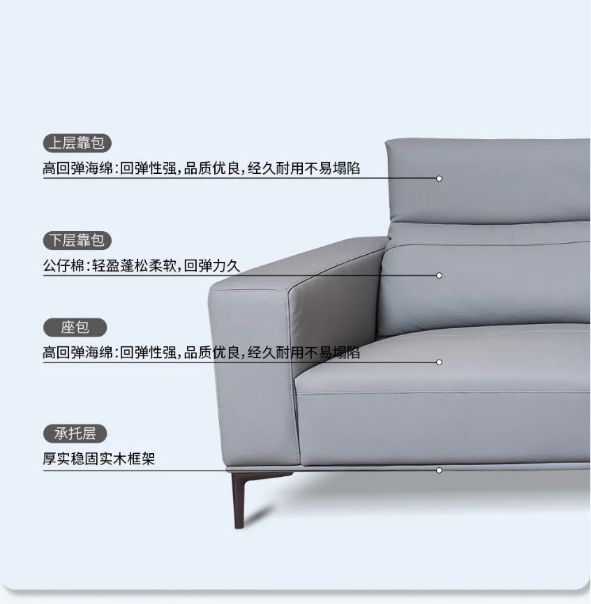 严选优质上乘皮料,确保生产出的沙发美观大方,皮质细腻,耐磨耐用,透气性好不闷热。接触面大面积采用头层黄牛皮,不计成本,只为打造舒适的使用体验。