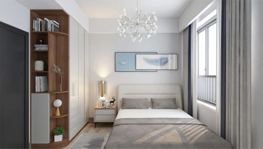 次卧强调了空间的收纳功能,到顶的衣柜设计不易积灰。