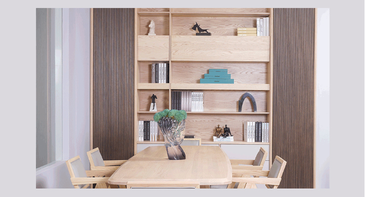 简洁、安静、自然、纯粹,白蜡木是极简主义的“女神”;而米灰色仿若一位含蓄优雅的绅士,举手投足之间,尽显含蓄优雅。烟熏色营造出朦胧沉静的暮色景象,就犹如优雅与风趣两个灵魂,命中注定般相遇的那个醉人傍晚。