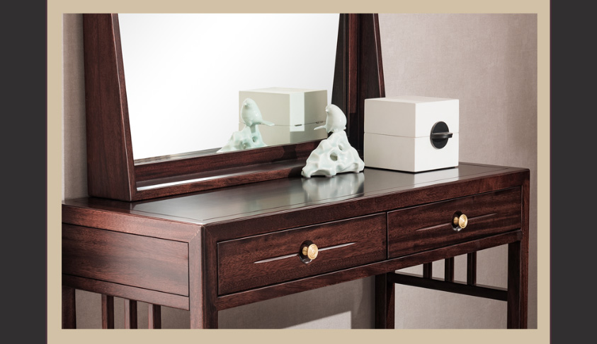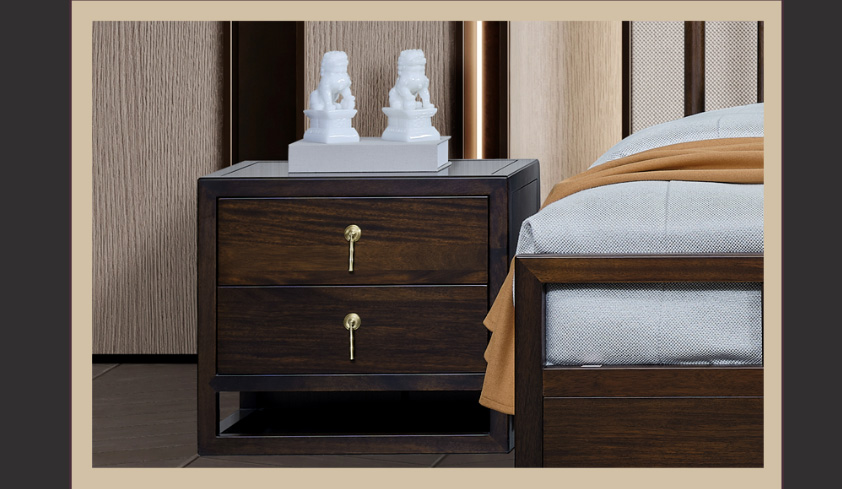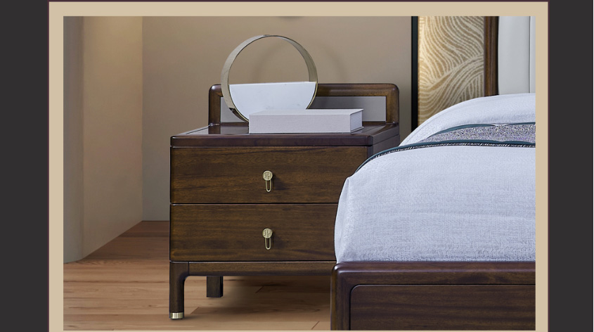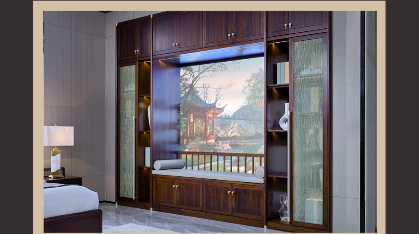 卧室保持原木色主基调,优雅的黑檀烘托出静谧的休憩氛围,皮质的包面与黄铜的点缀则提升了整体视觉温度。飘窗柜设计辟出一方休闲与收纳的空间,闲时临窗而坐,或开卷品鉴,或品茗悟道,或极目远眺,感古意悠然、雅韵四溢。