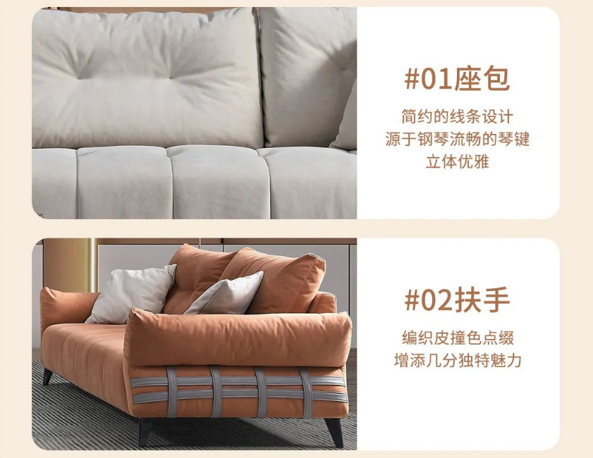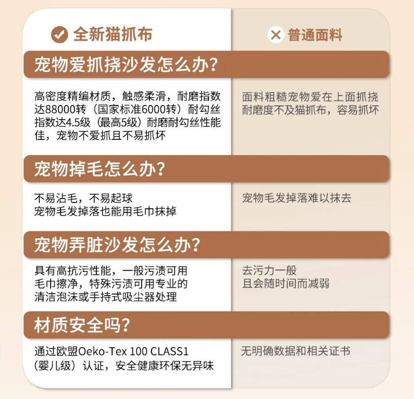 采用全新猫抓布面料,软糯的温柔质感,超耐磨无惧爱宠“魔爪”,防勾丝不沾毛,日常清洁打理方便,让您放心窝进沙发里与爱宠亲密相依。