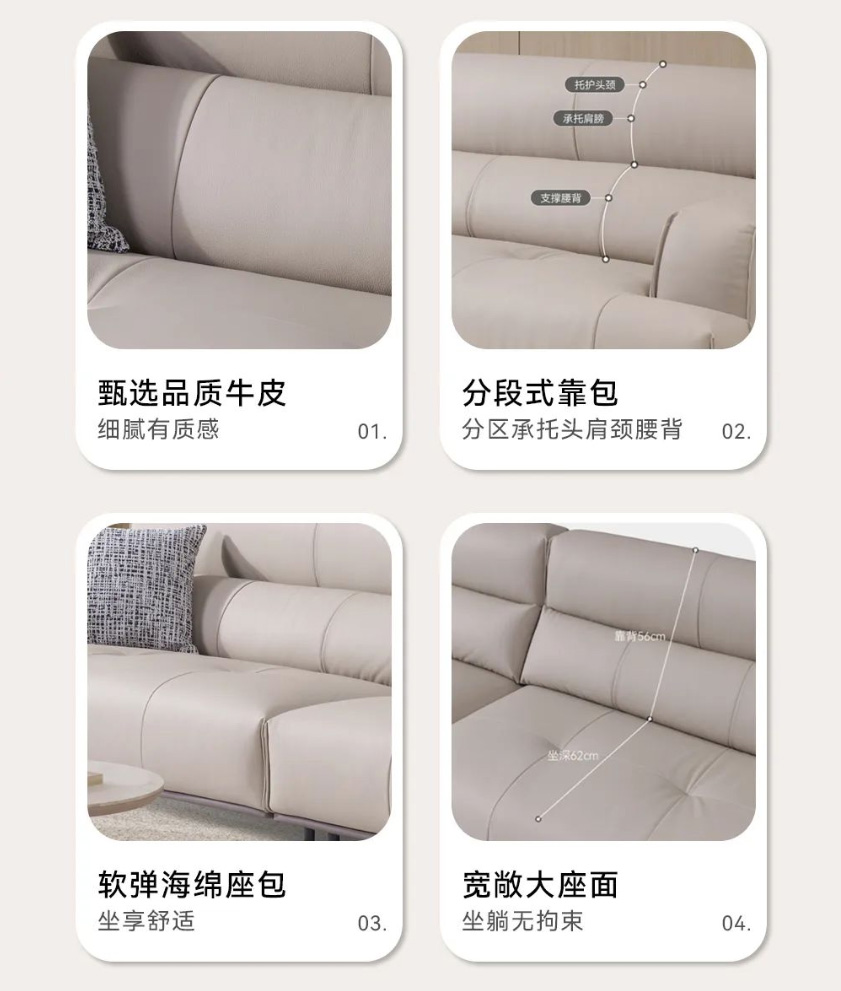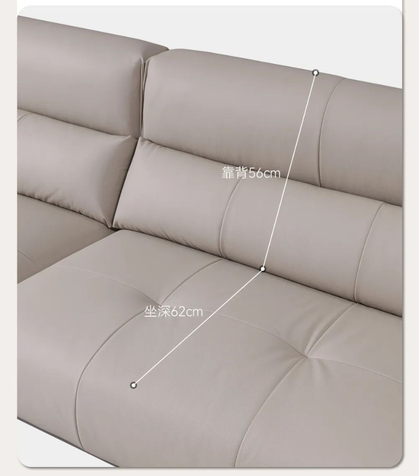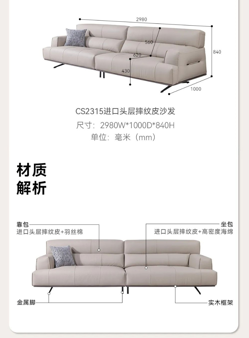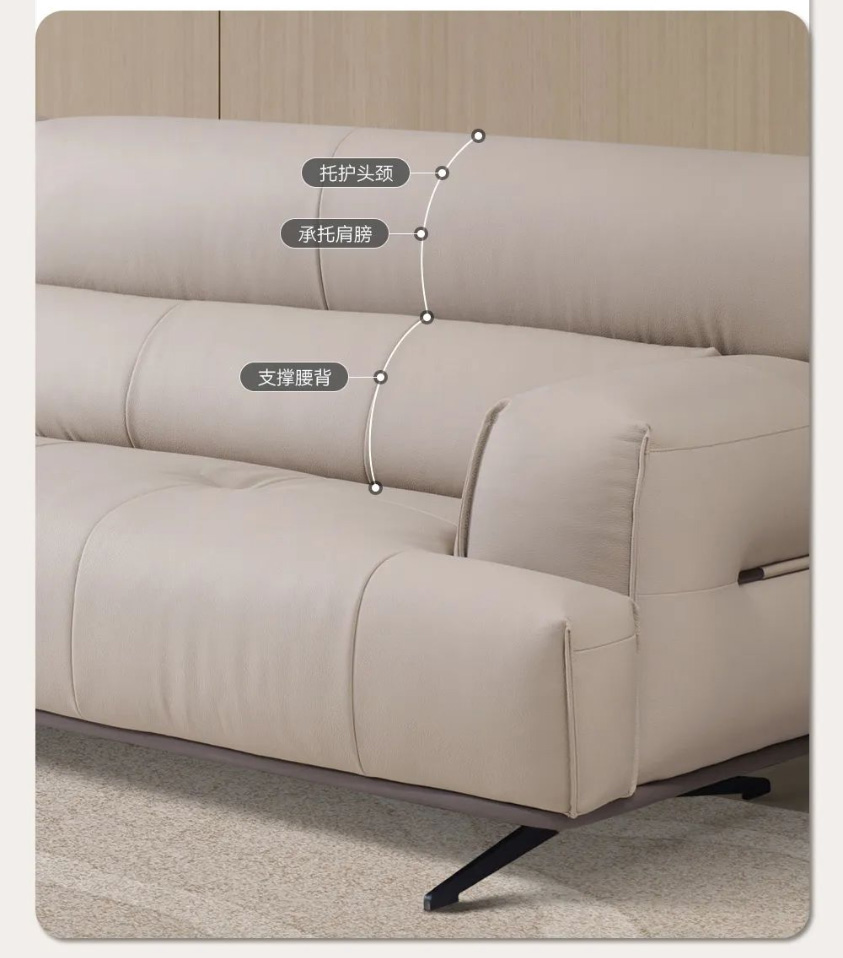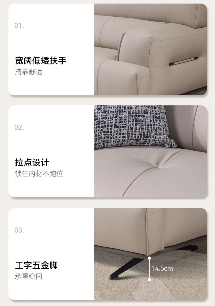 沙发以豪华轿车为设计灵感,豪华一字型设计,商务范儿十足;沙发表面由进口头层摔纹皮包裹,触感细腻顺滑,柔和亲肤;内材饱满填充高密度海绵,带来软弹舒适的独特坐感;靠包采用分段式的设计,更加贴合我们身体的曲线,头颈不悬空,身心更放松;两侧扶手圆润柔软,能够给手肘充分的承托,还能充当小置物台;两侧金属条装饰点缀,更显精致大气;工字型的金属沙发脚不仅更有设计感,也方便扫地机器人工作,让你省出更多时间陪伴家人。