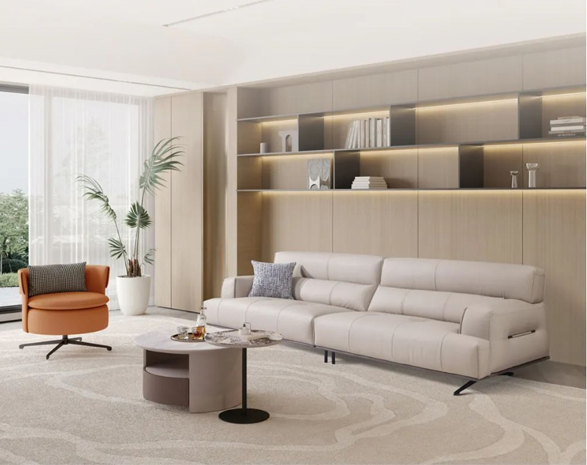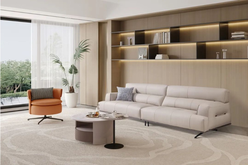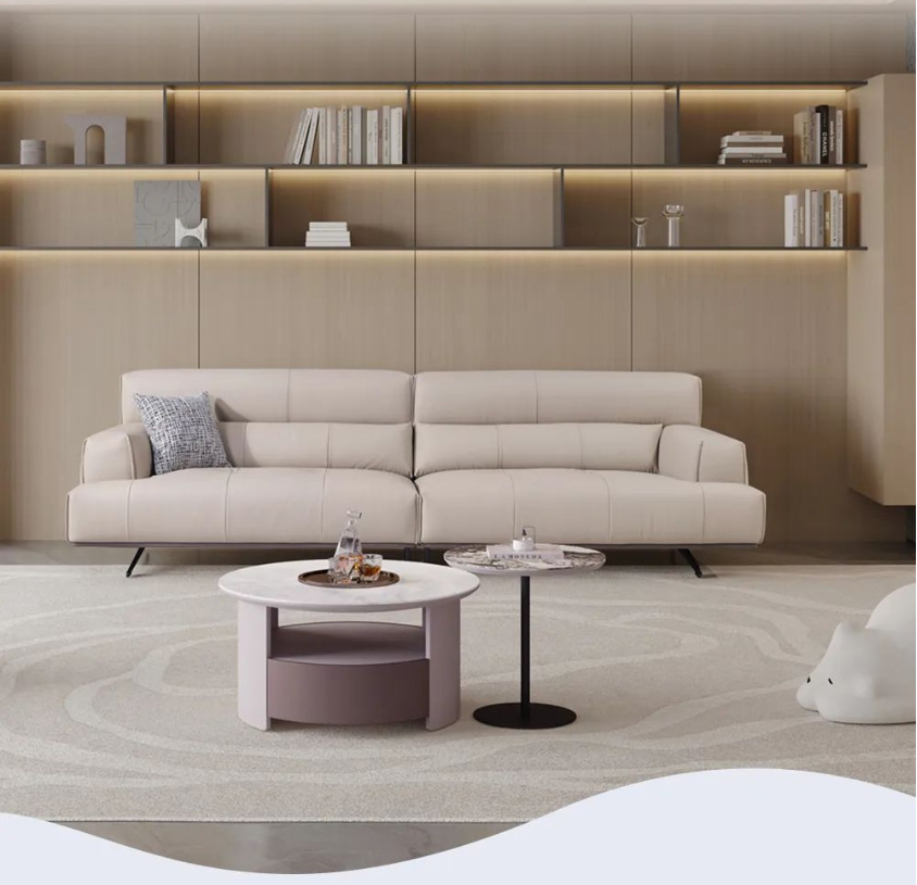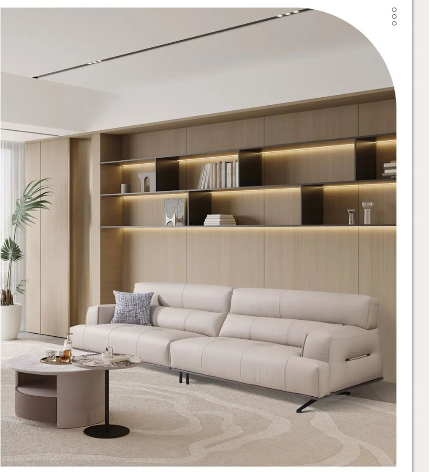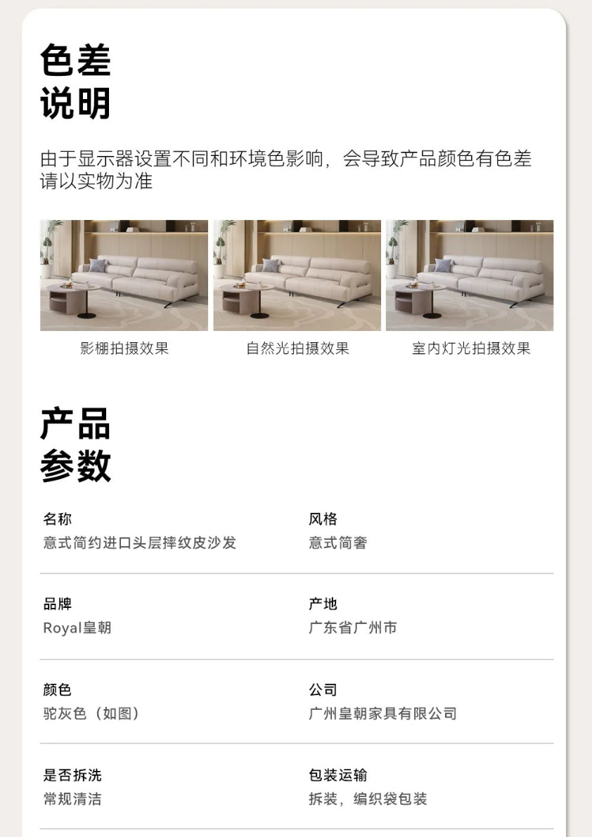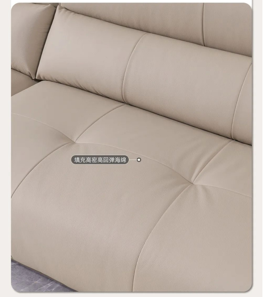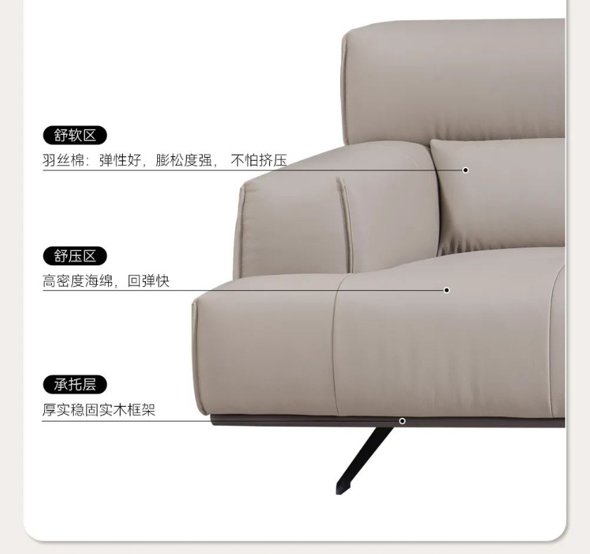 沙发以豪华轿车为设计灵感,豪华一字型设计,商务范儿十足;沙发表面由进口头层摔纹皮包裹,触感细腻顺滑,柔和亲肤;内材饱满填充高密度海绵,带来软弹舒适的独特坐感;靠包采用分段式的设计,更加贴合我们身体的曲线,头颈不悬空,身心更放松;两侧扶手圆润柔软,能够给手肘充分的承托,还能充当小置物台;两侧金属条装饰点缀,更显精致大气;工字型的金属沙发脚不仅更有设计感,也方便扫地机器人工作,让你省出更多时间陪伴家人。