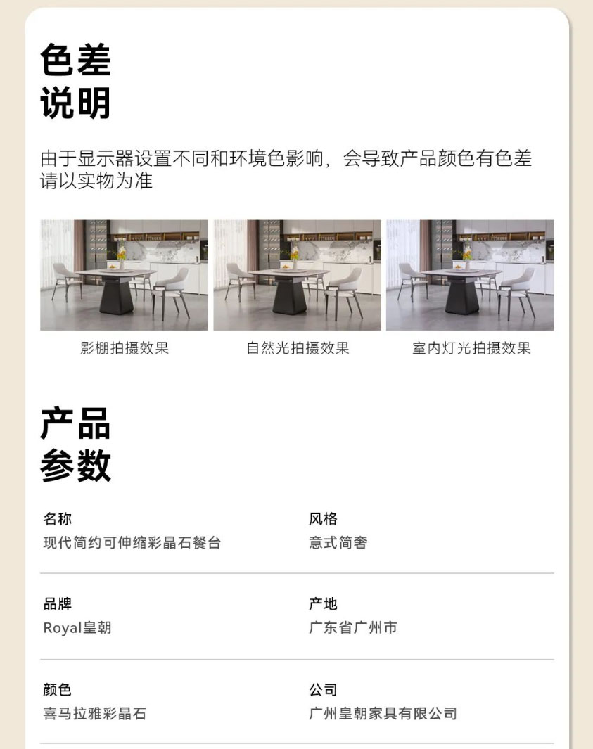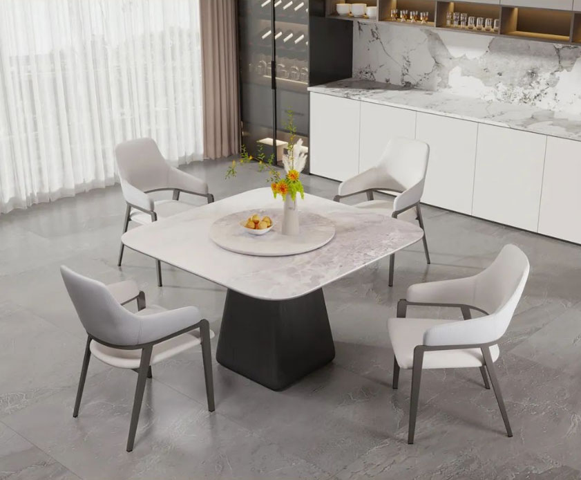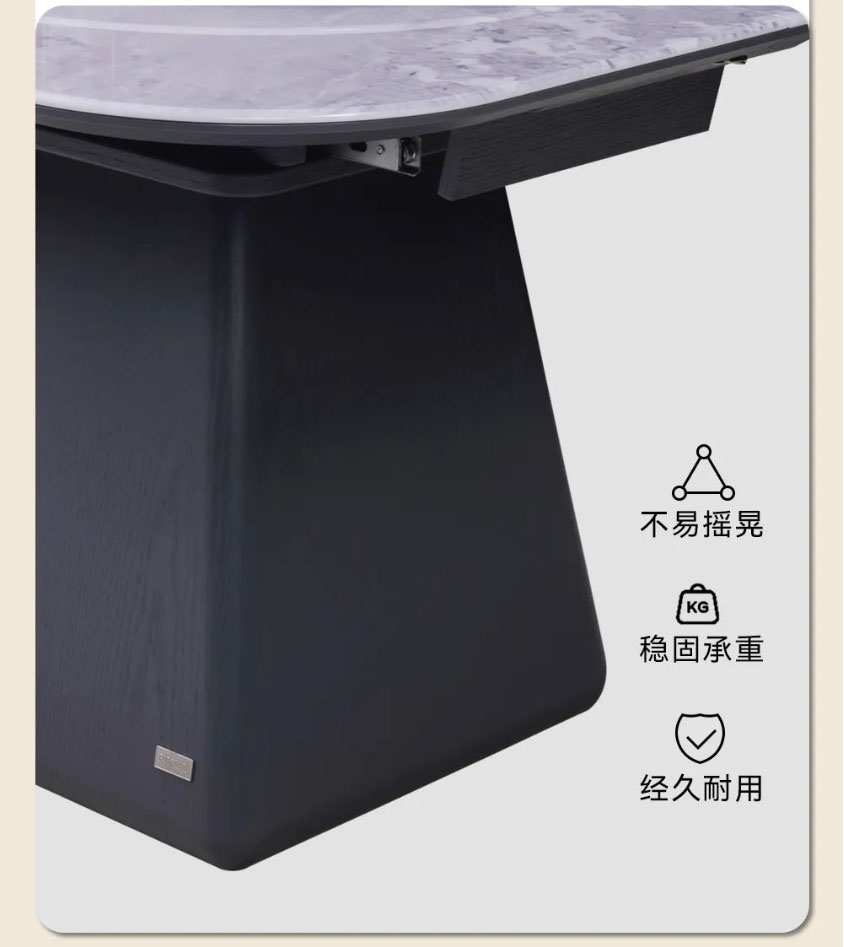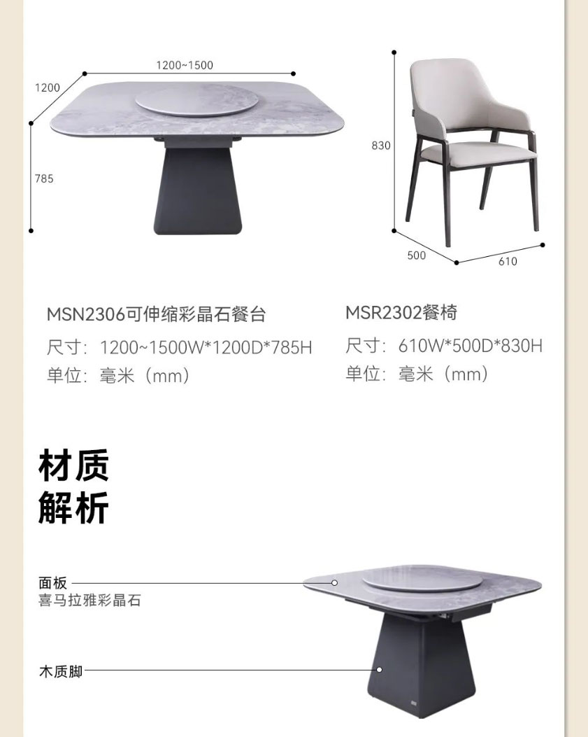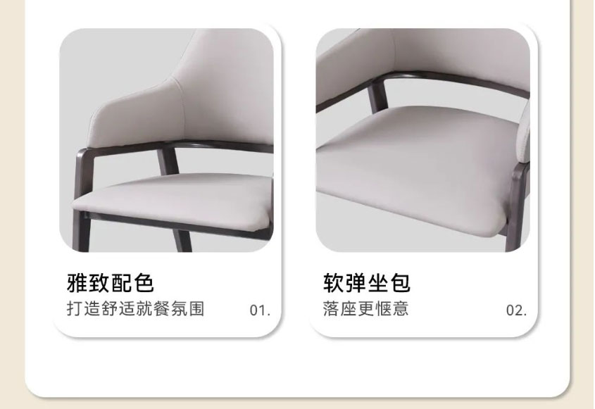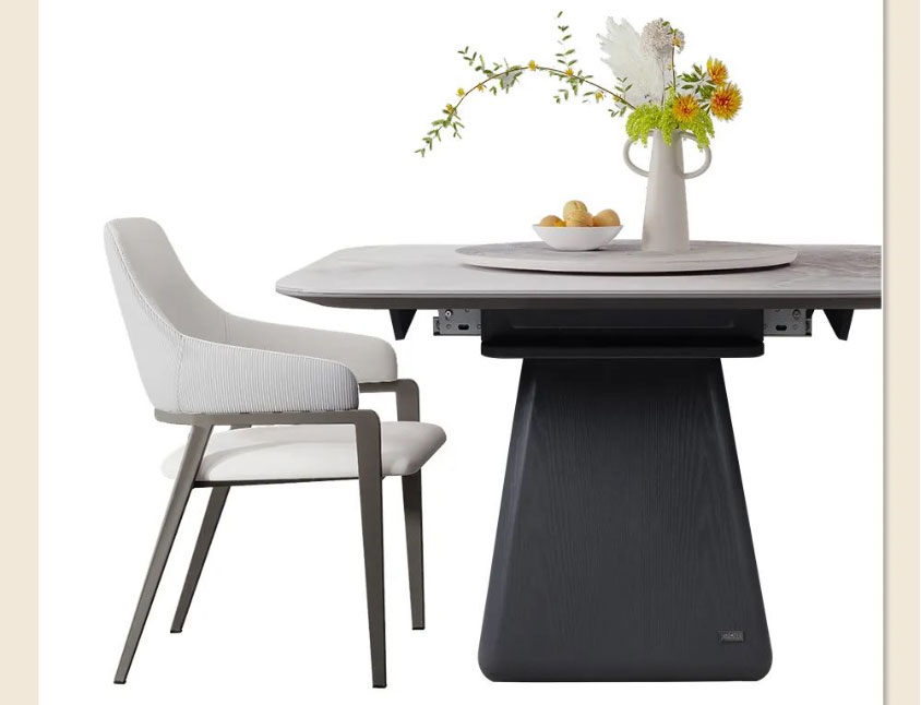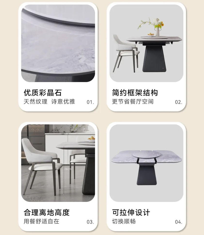 台面选用喜马拉雅彩晶石,天然纹理,诗意优雅,边缘还贴心地做了圆角处理;外嵌360°旋转圆盘,转动不卡顿、无噪音;餐桌采用木质中柱,低调内敛的朴质感中和了石材的清冷,上窄下宽的梯形设计既能稳稳托住台面,又给底部留足了活动空间,做到入座不挡腿。配套的米奢餐椅,以环抱柔软靠背和宽大海绵座包,带来更舒适的落座体验,让你在用餐时更从容惬意。