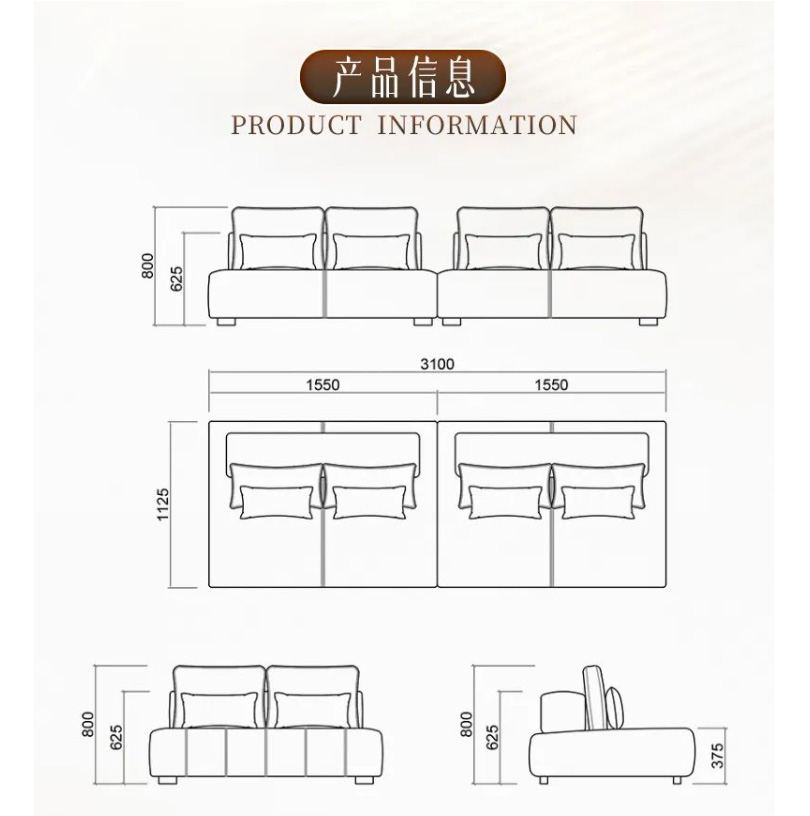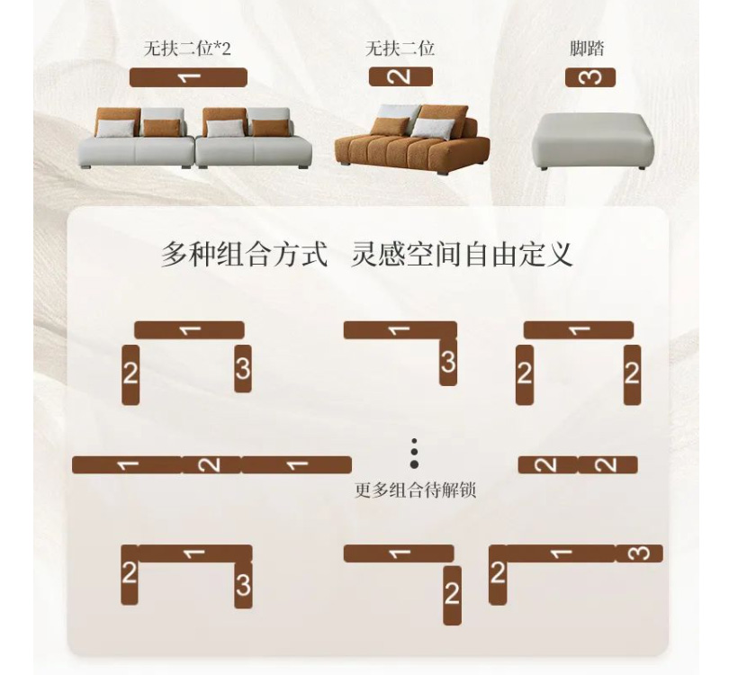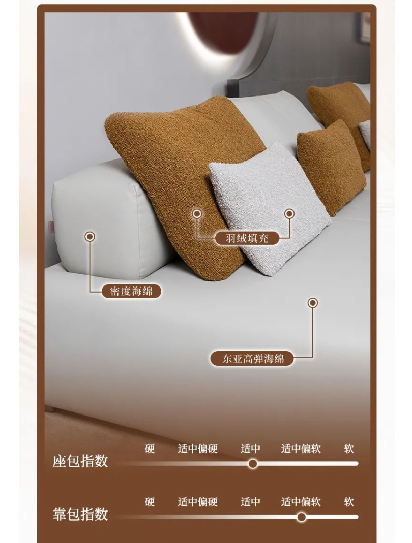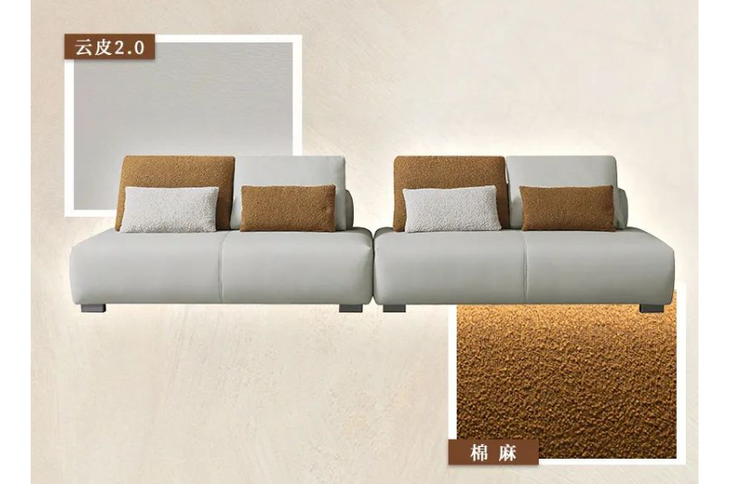 云皮2.0、棉麻、东亚海绵、羽绒、烟灰拉丝五金脚、全实木框架结构